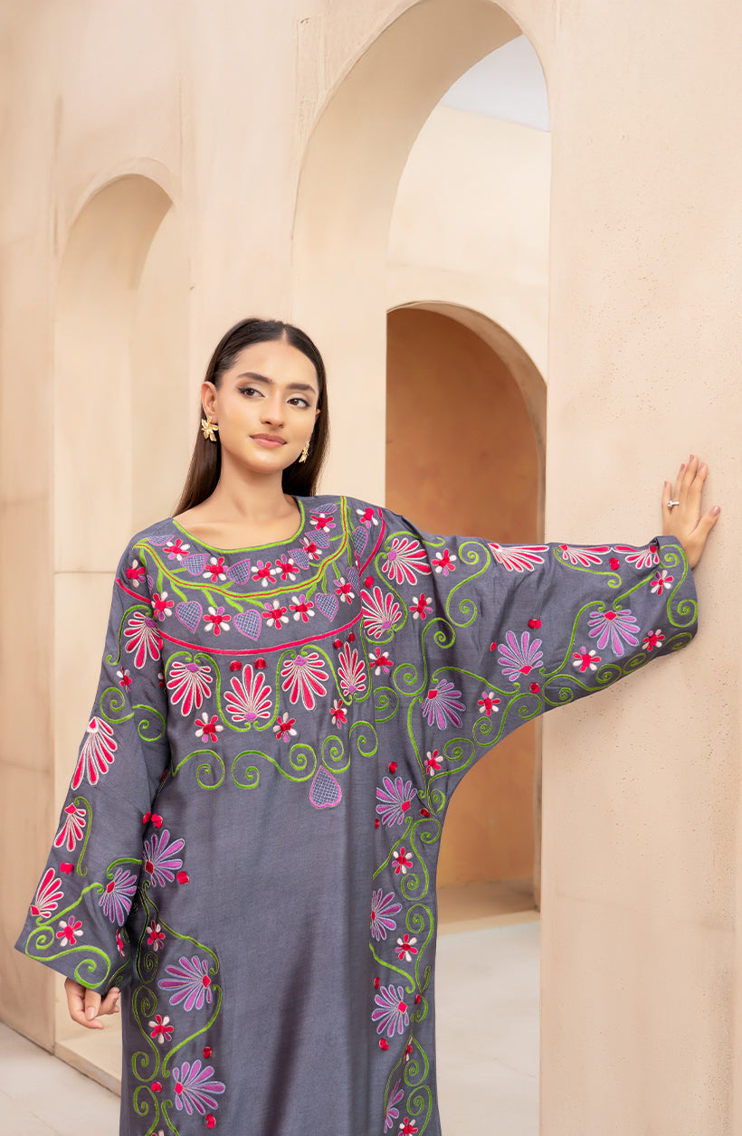 Aasma is a gray khaadi silk kaftan featuring multicolored embroidery across the neckline, sleeves, and sides. The flowing cut and wide sleeves give it a relaxed shape, allowing ease of movement and a flattering fall.
