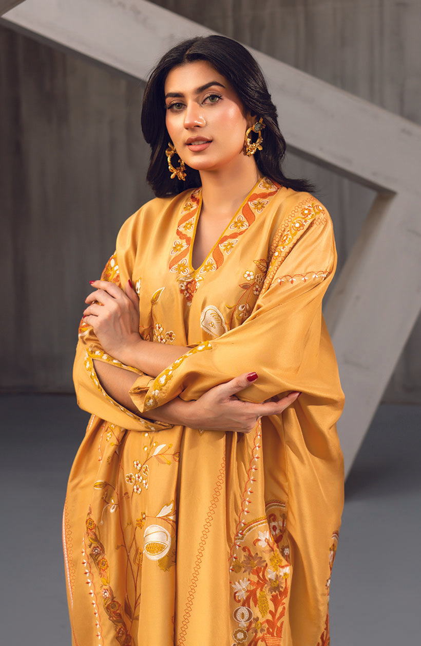Celebrate with the Lina Kaftan, a luxurious 1-piece statement outfit crafted in pure raw silk and drenched in a rich golden hue. This elegant kaftan reflects a bohemian soul wrapped in regal refinement.