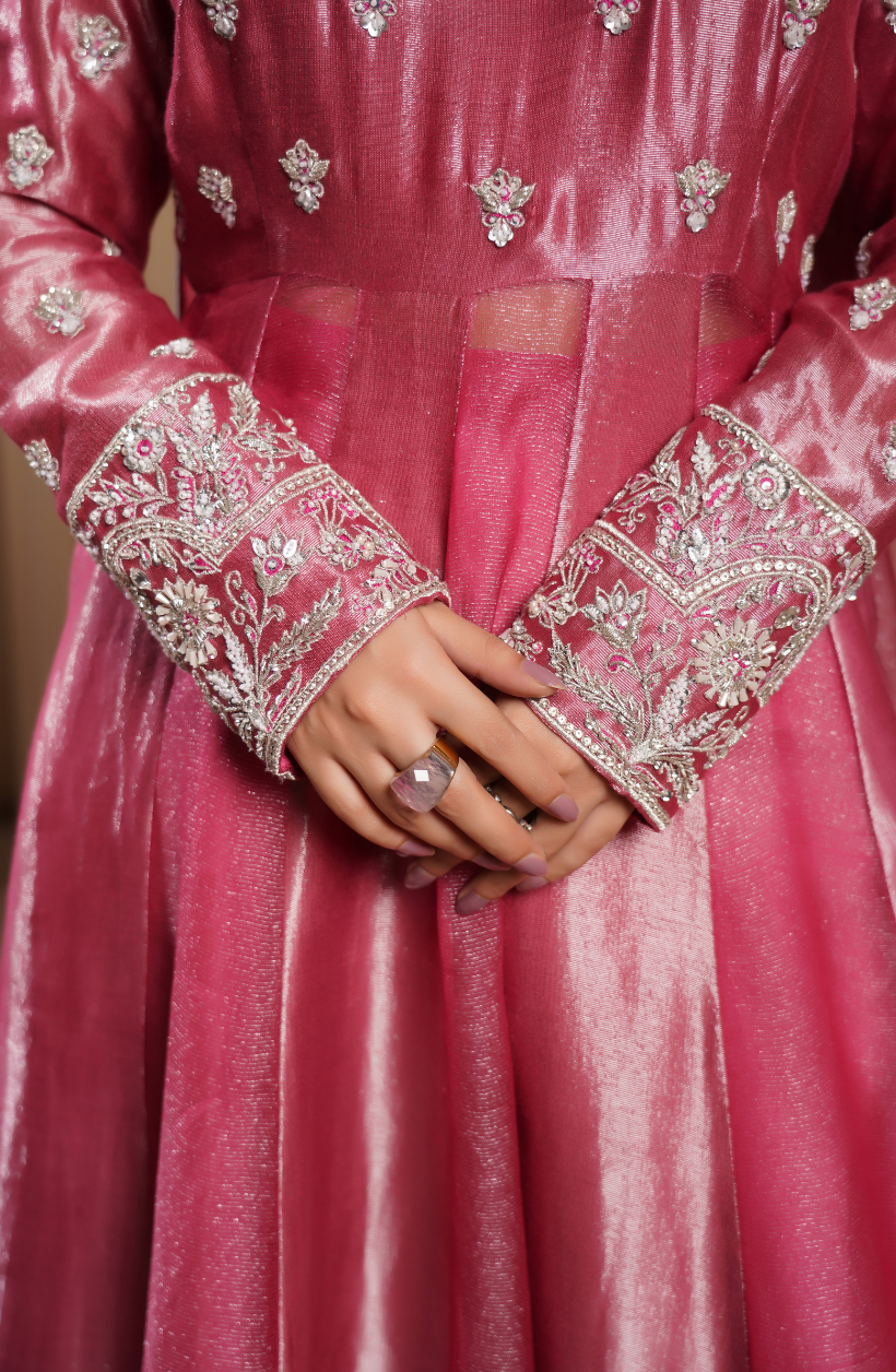 Pink maxi with round neckline and flared silhouette, detailed with scattered Resham and Tilla embroidery on the front. The handwork on cuff-style sleeves and embroidered lace along the hem.