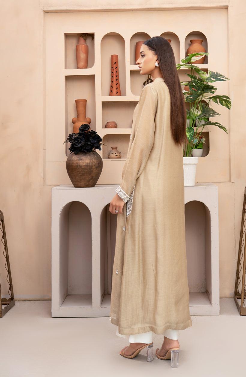 Reha is a light beige 2-piece outfit made in breathable Cora cotton. Embellished with small, handcrafted adda detailing throughout, this long shirt offers a simple and clean look for everyday gatherings or festive moments.