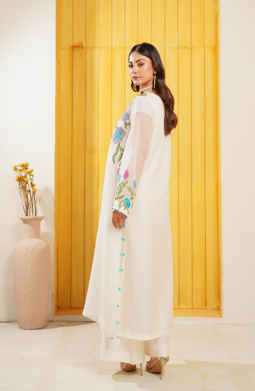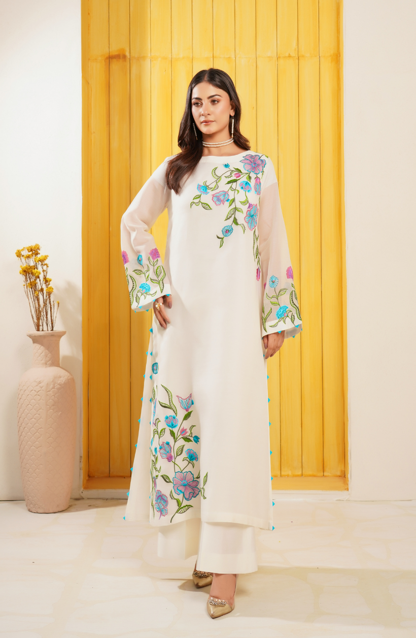 A white Cora Cotton Set with a round neckline and airline cut featuring an airline-cut shirt with Resham floral embroidery in multi-coloured threads.