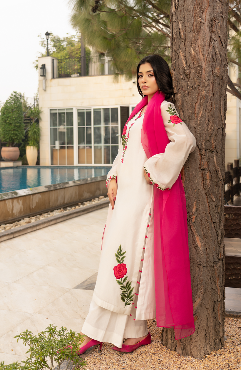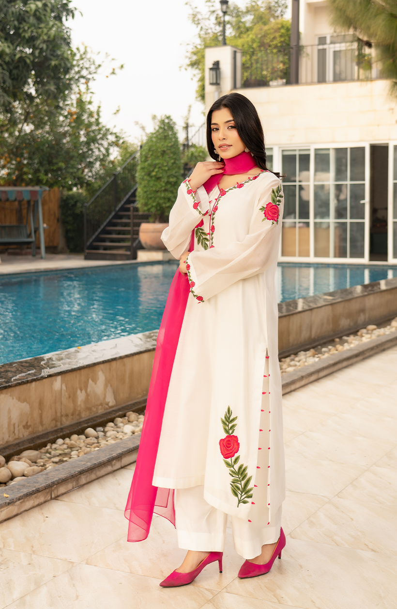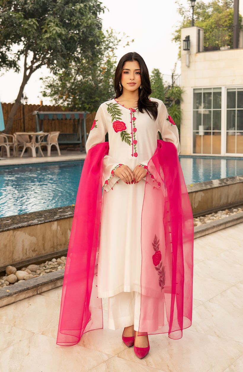 A timeless White Cotton 3 Piece Suit crafted in breathable Cora Cotton, designed for elegant everyday wear. The shirt features resham work on a V neckline with floral embroidered detailing, balanced with a plain back and Pink Dopatta, perfect for warm-weather comfort and refined style.
