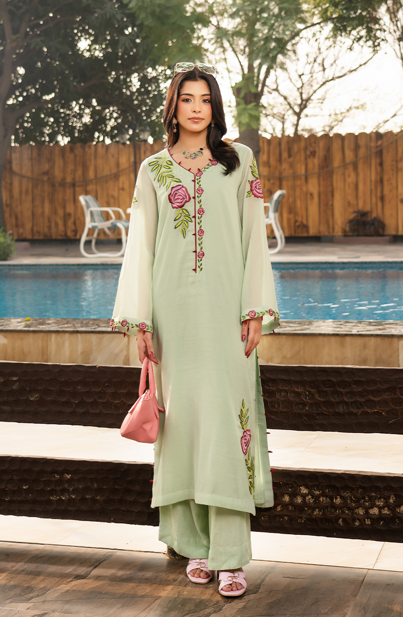 Fresh and feminine, the Pista Cotton 2 Piece Suit is made in breathable Cora Cotton for all-day comfort. Featuring resham-work V neckline with floral embroidered detailing, finished with a plain back and matching trousers.