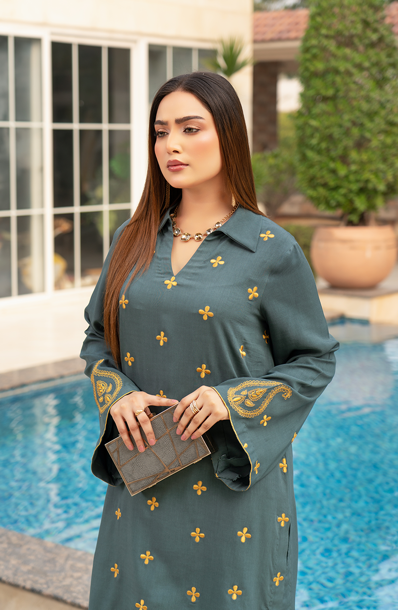 Collared neckline, long shirt with full-length sleeves, detailed with resham embroidery across the front and more sleeves for a dressed-up finish.