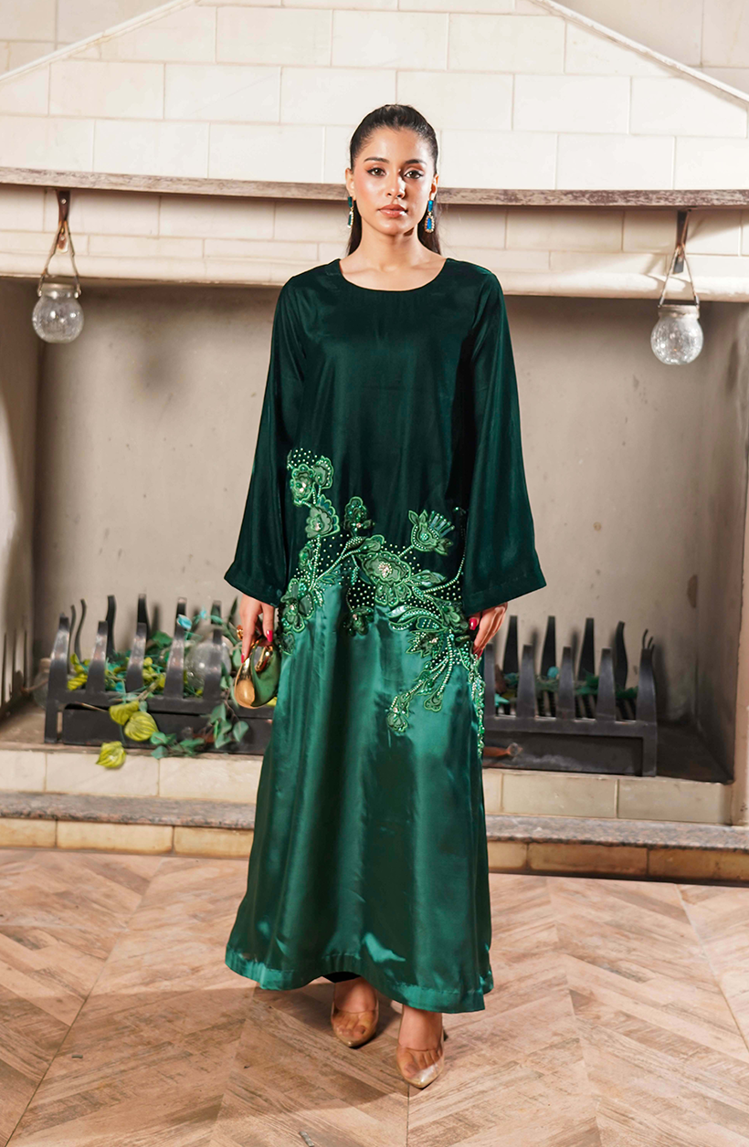 An Emerald Green Velvet + Shamoz 2-Piece Suit crafted in velvet and shamoz. The round-neckline long gown-style shirt features 3D work across the front, paired with straight trousers.