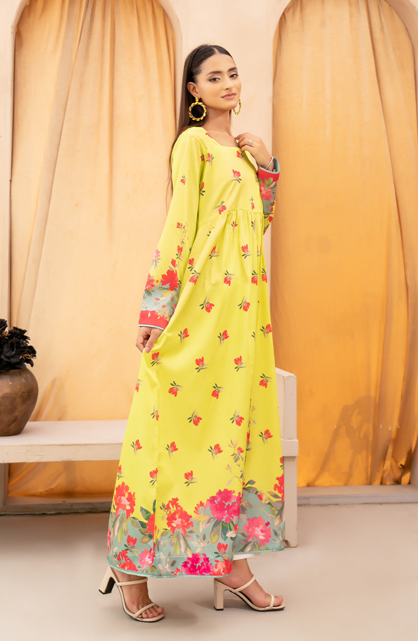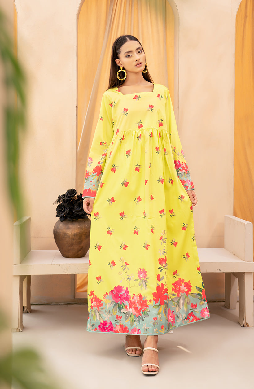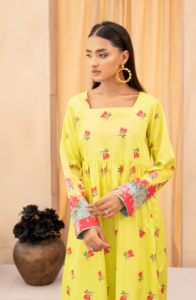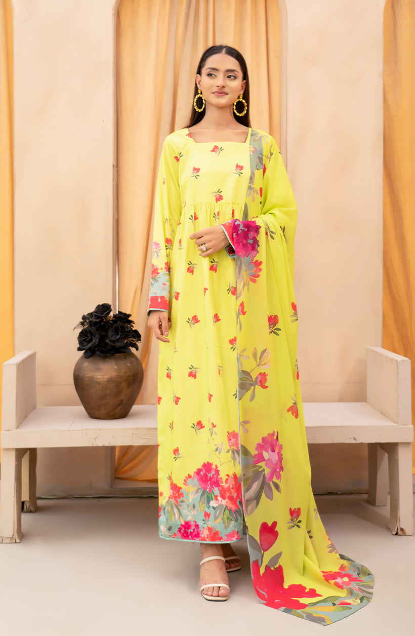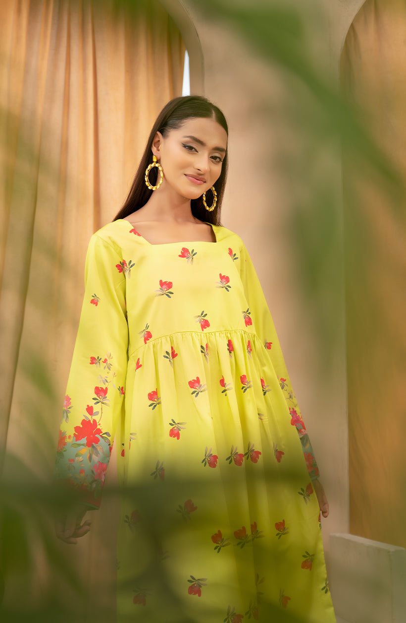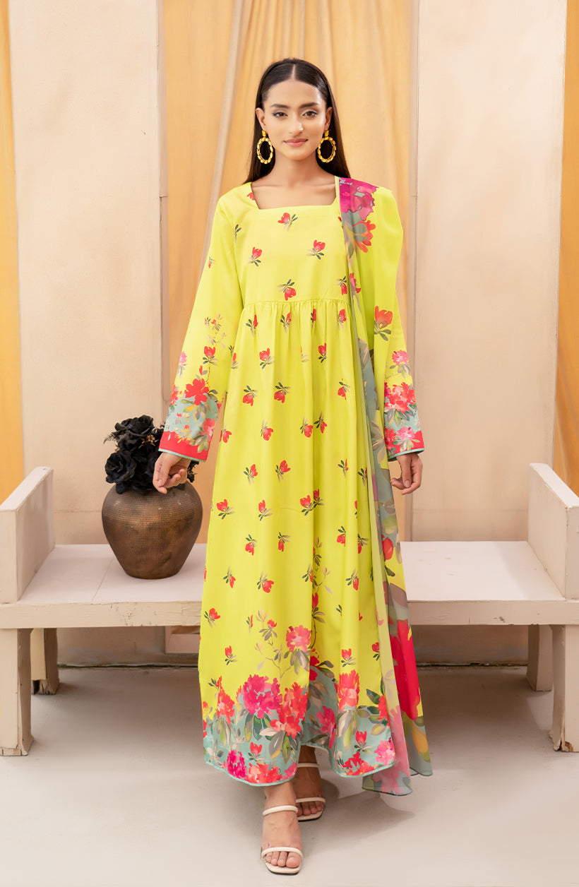 Subah is a 3-piece casual maxi outfit designed in soft shamoz fabric. Printed in cheerful floral tones, the lemon base adds brightness while the flowy silhouette brings ease and comfort. Paired with matching trouser and a lightweight jorjet chiffon dupatta, this look is perfect for warm-weather outings and relaxed gatherings.