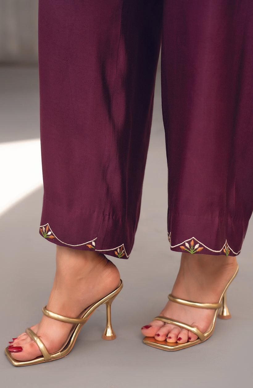 Make a striking impression with the Zee Top in a deep purple hue, tailored from luxurious Khaadi silk. This elegant 2-piece set by Tahira Meer combines traditional charm with modern versatility.