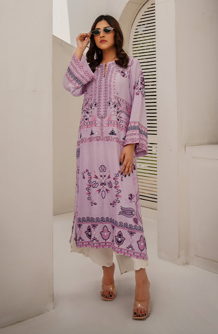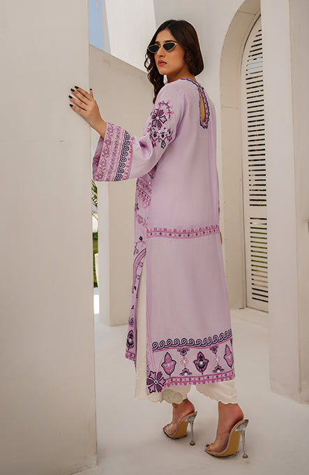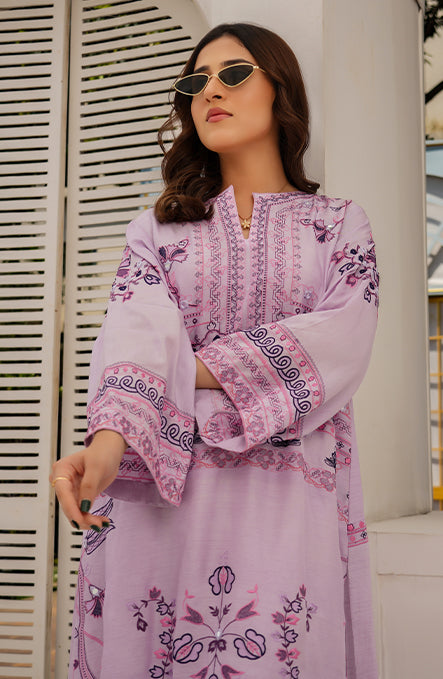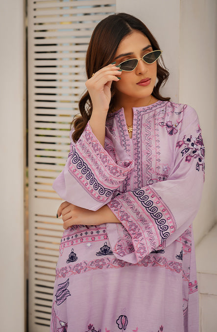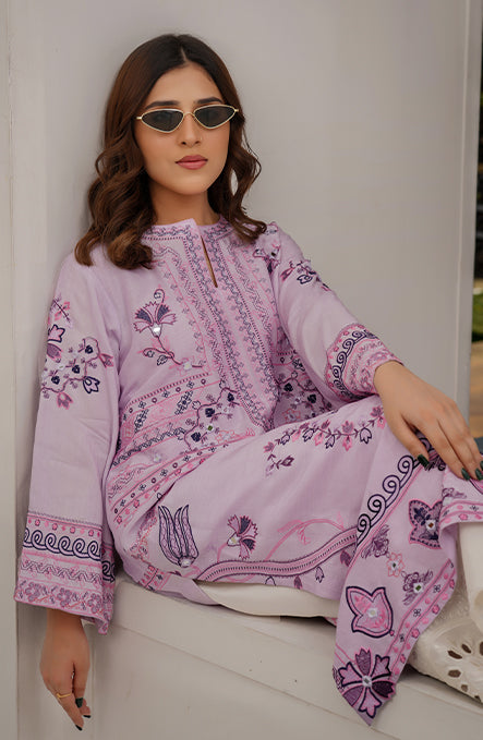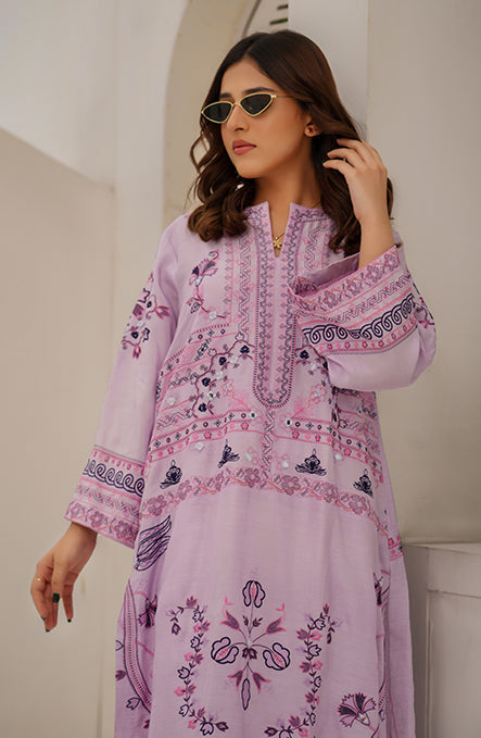 Featuring a purple raw silk shirt adorned with intricate embroidery, extending its elegance to the embroidered sleeves. Paired impeccably with soft silk trouser, boasting embroidery and a chic scallop cut, this ensemble exudes sophistication and refined charm, perfect for any special occasion.
